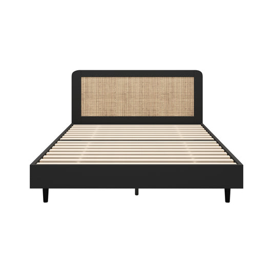 Queen Size Bed Frame with Real Rattan Headboard Black
