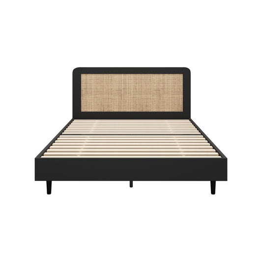 Double Bed Frame with Real Rattan Headboard Black
