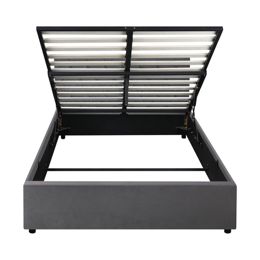 Queen Size Bed Frame with Gas Lift Storage Base Fabric Grey