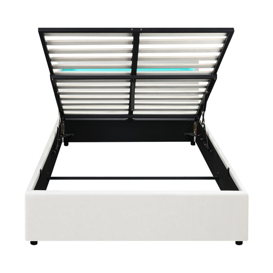 Double Bed Frame with RGB LED and Gas Lift Storage Base White