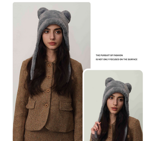 Light gray Fluffy Cat Ear Winter Earflap Hat Women Knitted Warm Cold Weather Cap