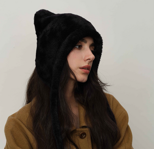 Black Fluffy Cat Ear Winter Earflap Hat Women Knitted Warm Cold Weather Cap