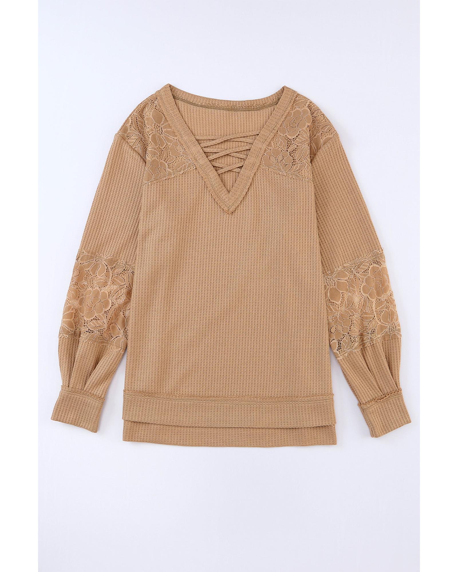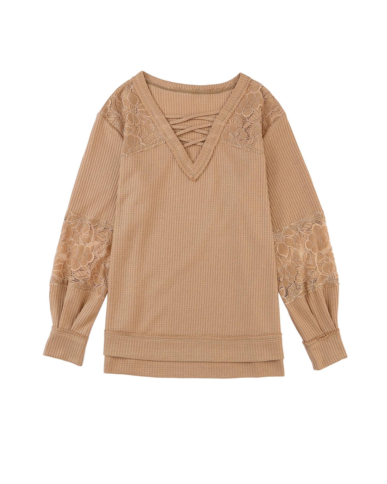 Azura Exchange Lace Waffle Patchwork Strappy V Neck Long Sleeve Top - S