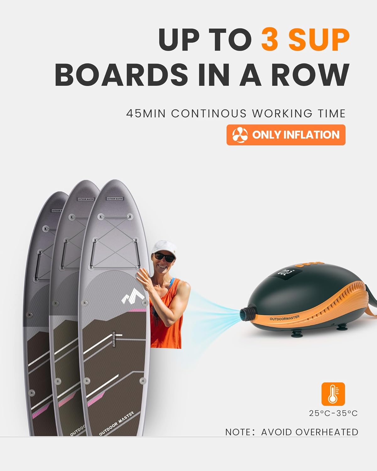 Max 20 PSI High-Pressure System This portable electric SUP air pump inflates a 260L paddle board in just 10 minutes, reaching up to 20 PSI. Powered by 12VDC, it offers fast and efficient inflation with a 40L/min airflow rate, ensuring a smooth and quick setup for your paddle board.