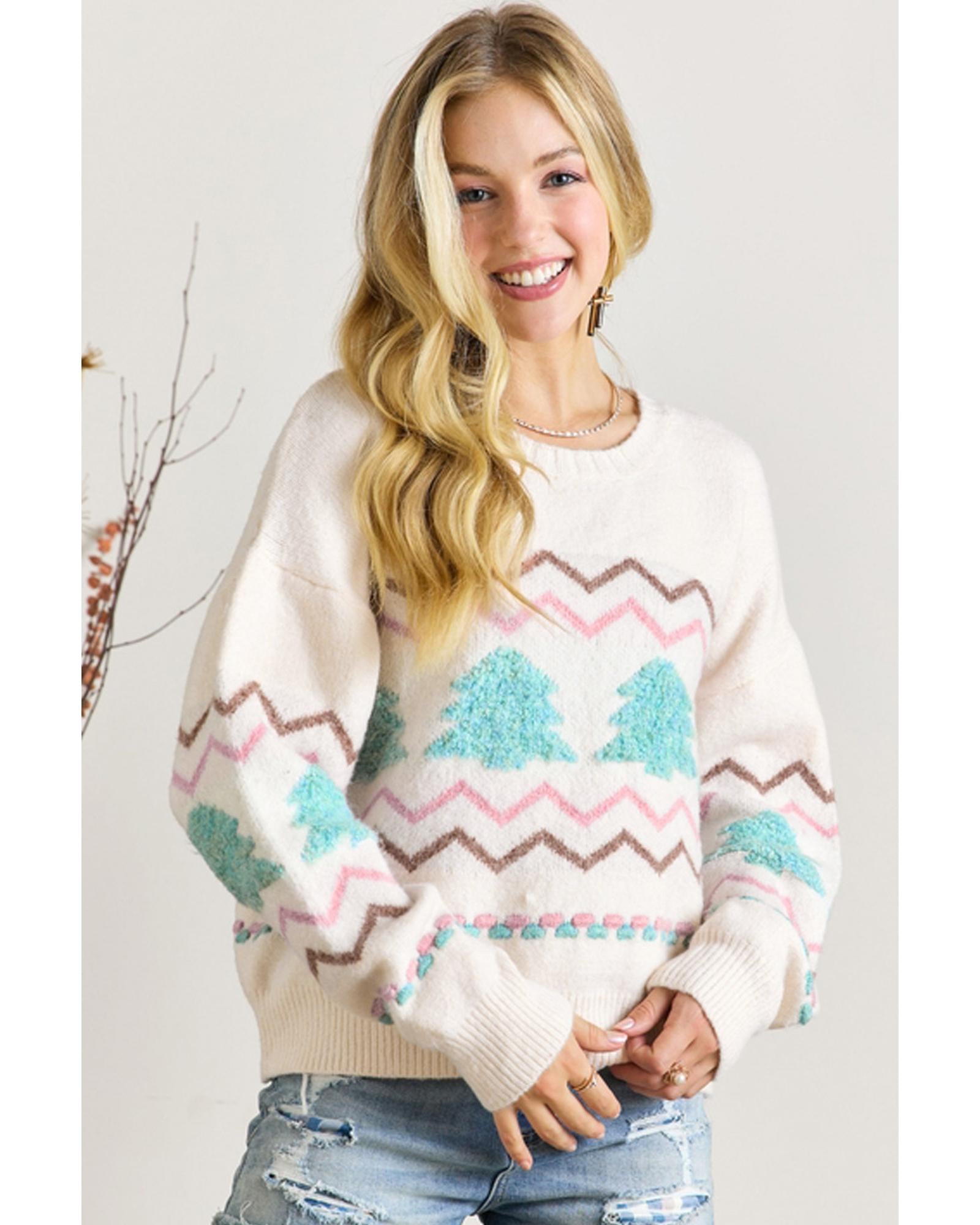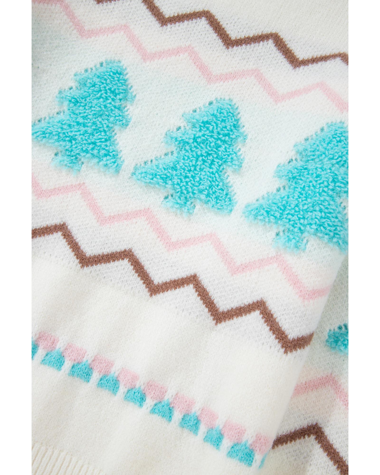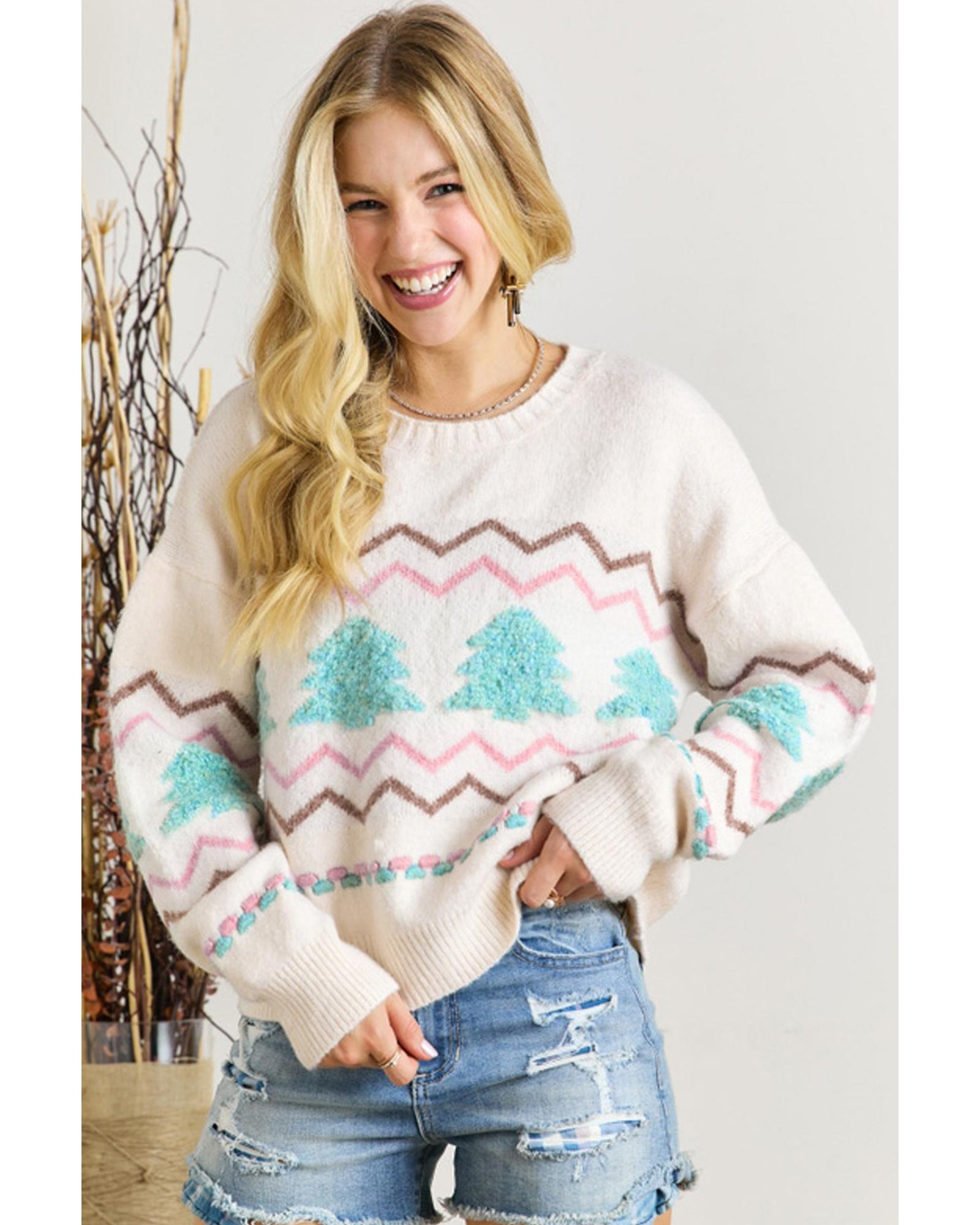 White Striped Christmas Tree Ribbed Trim Drop Shoulder Sweater - S
